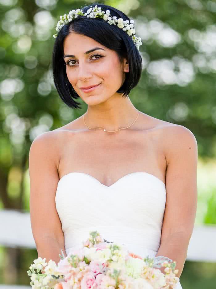 Для невест с короткими волосами или прической средней длины, стилисты рекомендуют простые, лаконичные прически с использованием различных аксессуаров (лент, ободков, заколок и живых цветов). Сегодня в моде естественность, поэтому от сложных укладок и лакированных локонов, которые выглядят ненатурально, лучше отказаться