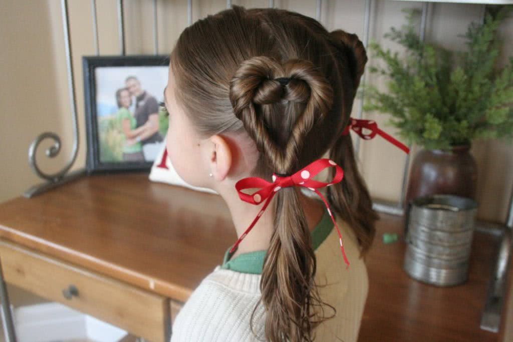 Сделать двойные косички в виде сердца просто. Разделить гребешком волосы на зоны в форме сердца, прямым пробором. Заплести внешнюю косу начиная ото лба и заканчивая к затылку в форме сердца. После заплести внутреннюю косичку, можно вплести в нее ленту. Затем завязите свободные волосы в хвостик.