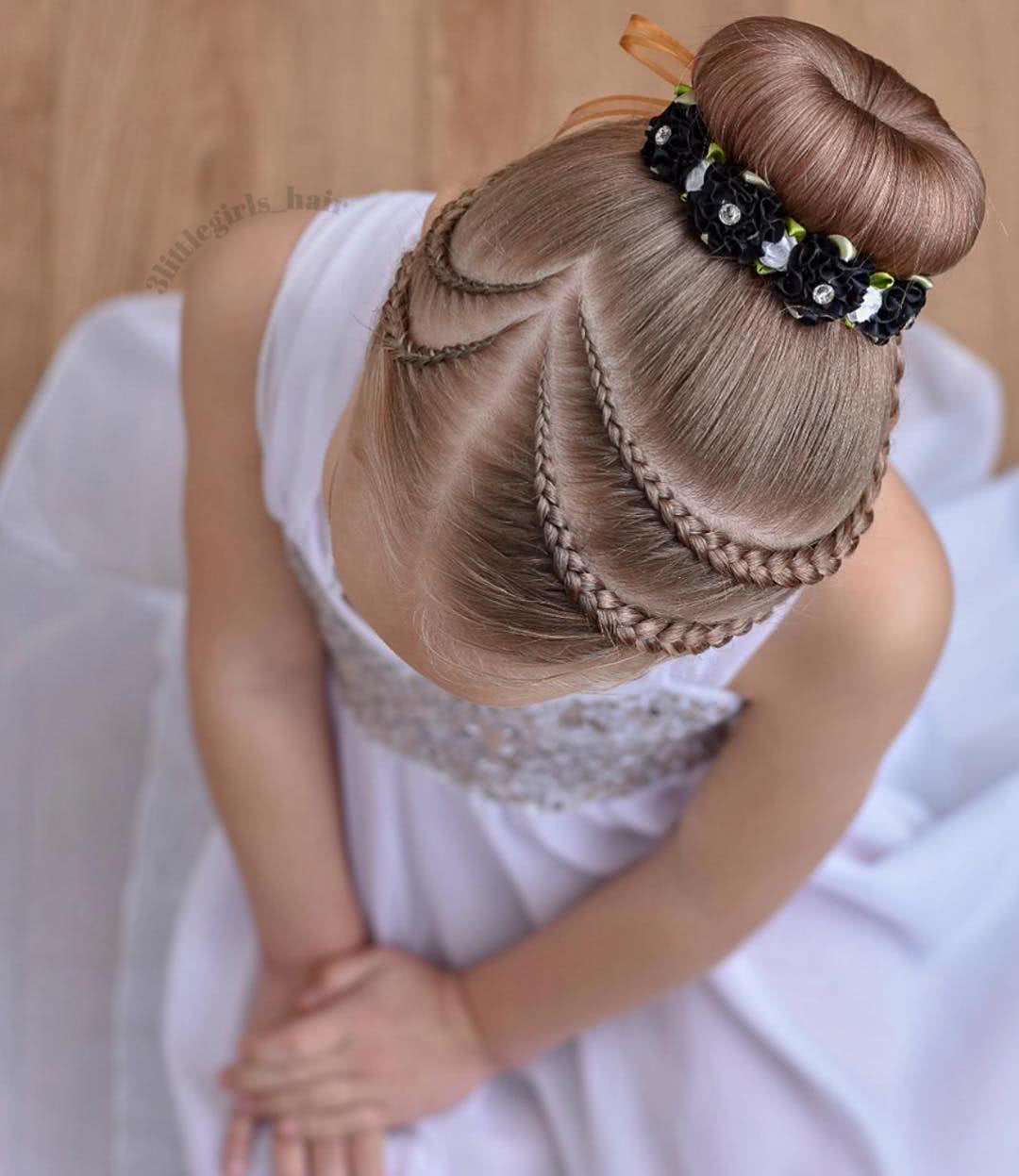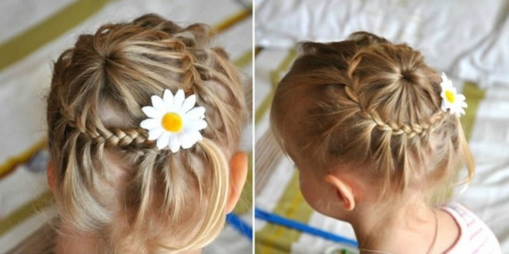 Если крошка является обладательницей длинных волос, то это отличный повод для экспериментов. Попробуйте сделать пучок из четырех косичек. Из них нужно сформировать подобие цветка и закрепить шпильками. Украсить готовую прическу цветочным декором. Получится нежный вариант, который позволит придать образу большей мимимишности.