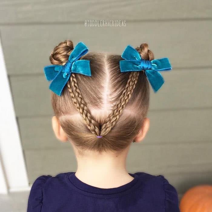 Два пышных пучка над ушами и цепочка из тонких прядей – все, что требуется для получения интересного образа.