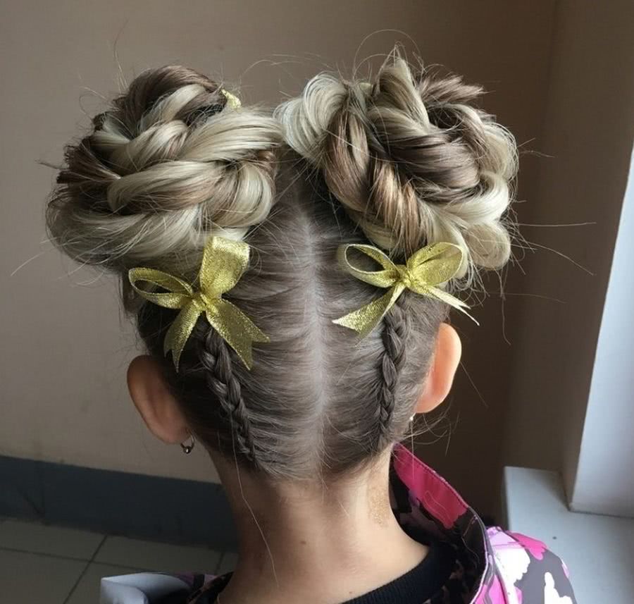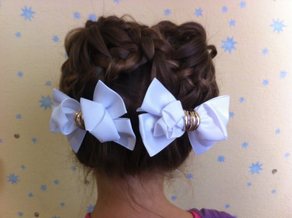 Это могут быть объемные пучки с французскими или голландскими косами, в сочетании с паутинкой, плетением из резинок, скрученных жгутов. Очень красиво и даже по-праздничному смотрятся прически для девочек из пучка и плетения из множества прядей.