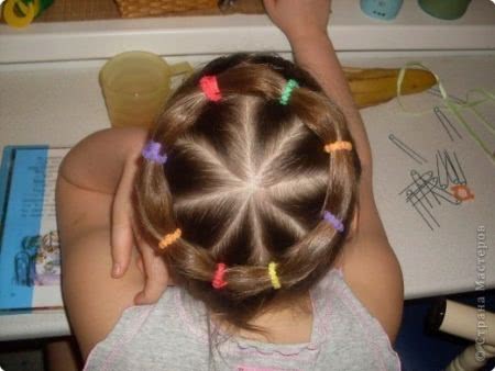 Обыкновенными резинками можно сделать красивый венок из волос. Эффектность прически достигается благодаря ровным проборам по кругу, а также использованию разноцветных резинок. Волосы не мешают и смотрятся по-детски весело.