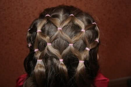 Очень красивая и оригинальная прическа. Разделить волосы на четыре ровных зоны. В каждой отдельной части заплести косички. Пропустить через петли двух косичек яркую ленту. Вплетать ее стоит туго, чтоб получить четкий эффект.