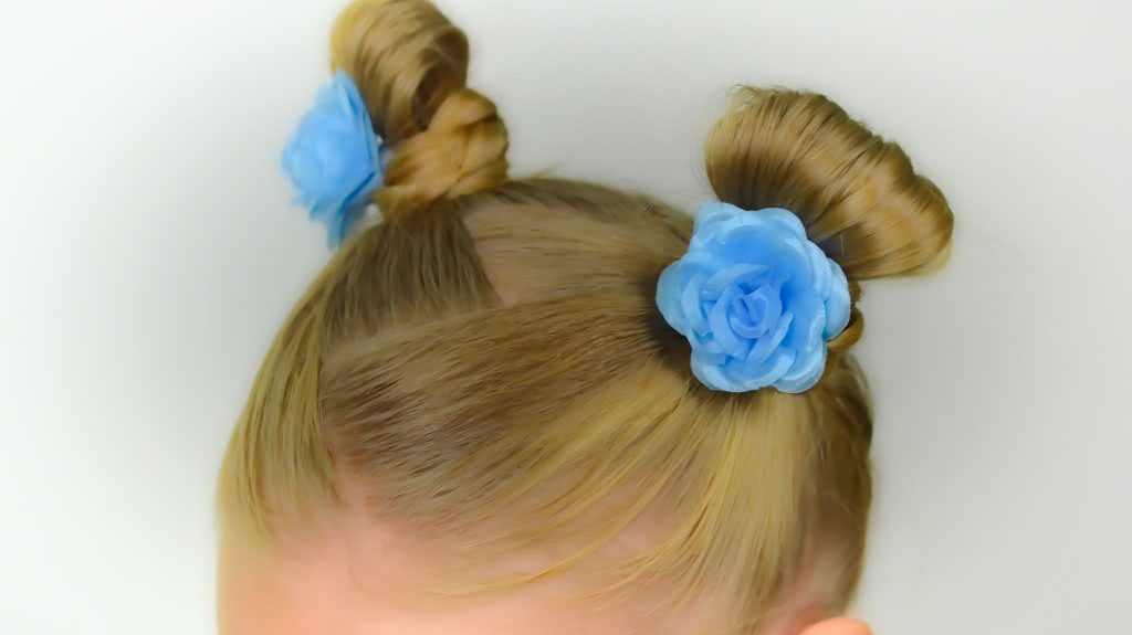 Чтобы сделать эту детскую забавную прическу понадобится не более 5 минут. Для начала волосы делятся пополам и по бокам оформляются хвосты, которые потом прокручиваются. Затем хвосты нужно поделить на две части, каждую из них скрутить в жгут и соединить их внизу резинкой, как показано на пошаговом фото.