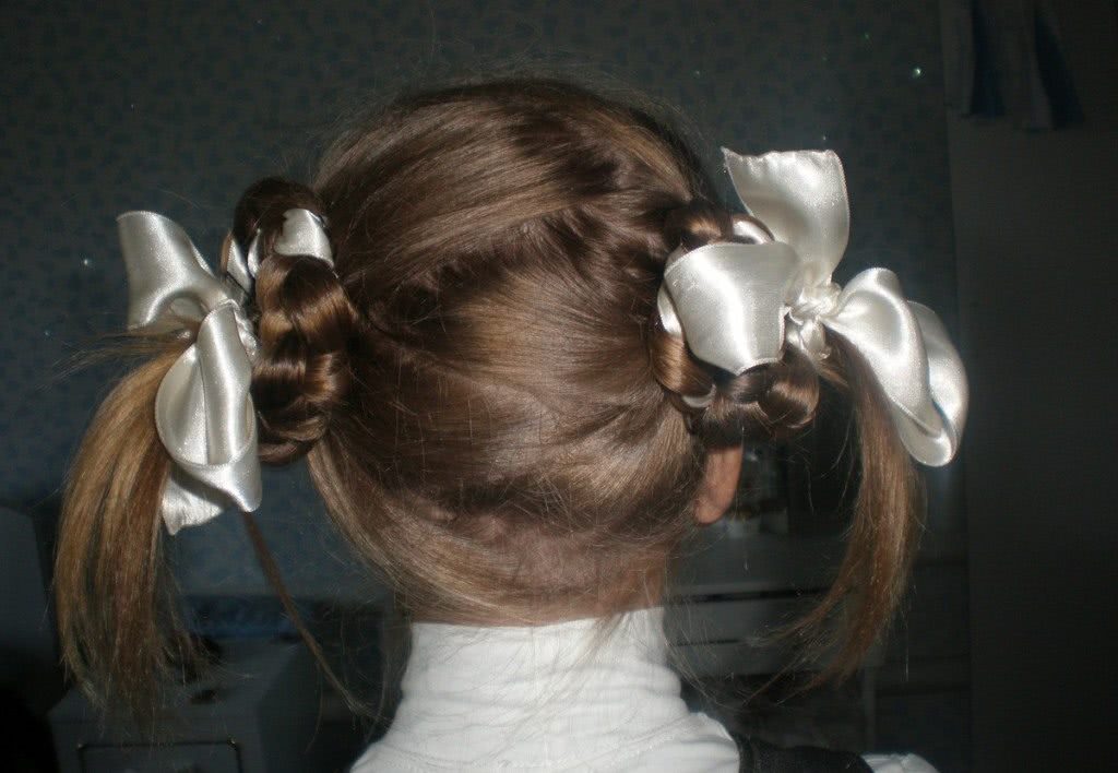 Для начала делается пробор, он может быть любым, как прямым, так и в виде зигзага. Внизу под ушами завязывается два хвоста. Из этих хвостов плетутся косы, которые внизу фиксируются маленькой резиночкой. Затем данную косичку надо сложить пополам, таким образом, чтобы кончики оказались со стороны ушей, этот подворот фиксируется маленькой резинкой.