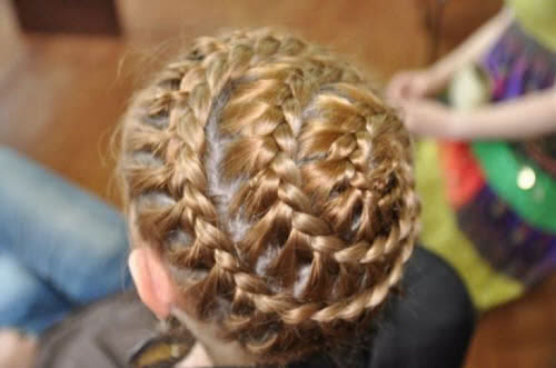 - Сзади также заплести несколько косичек, края скрепить резинками.