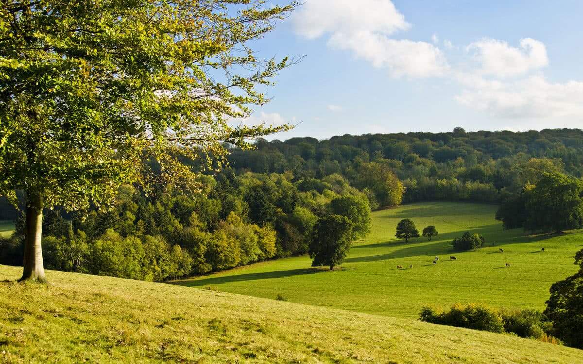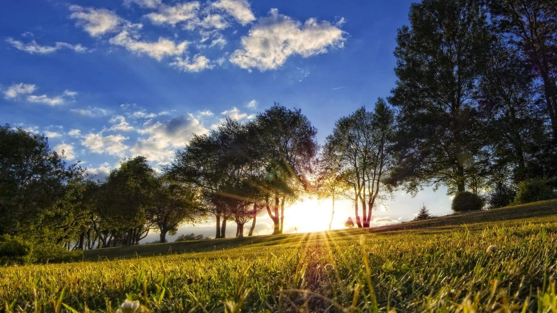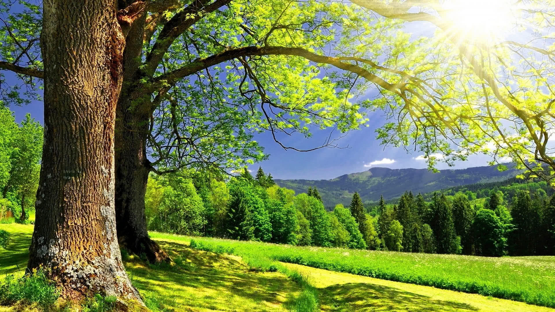 Красивая поляна и солнце, пробивающееся через крону дерева