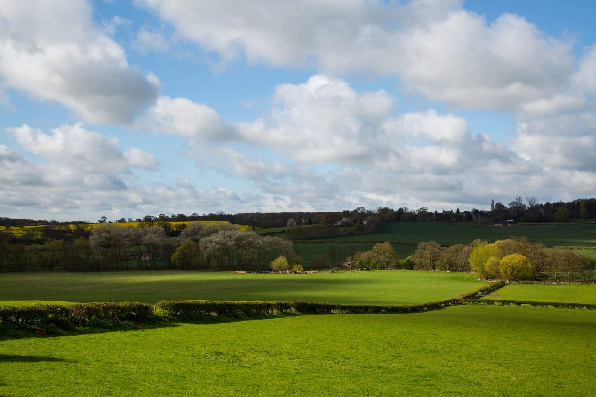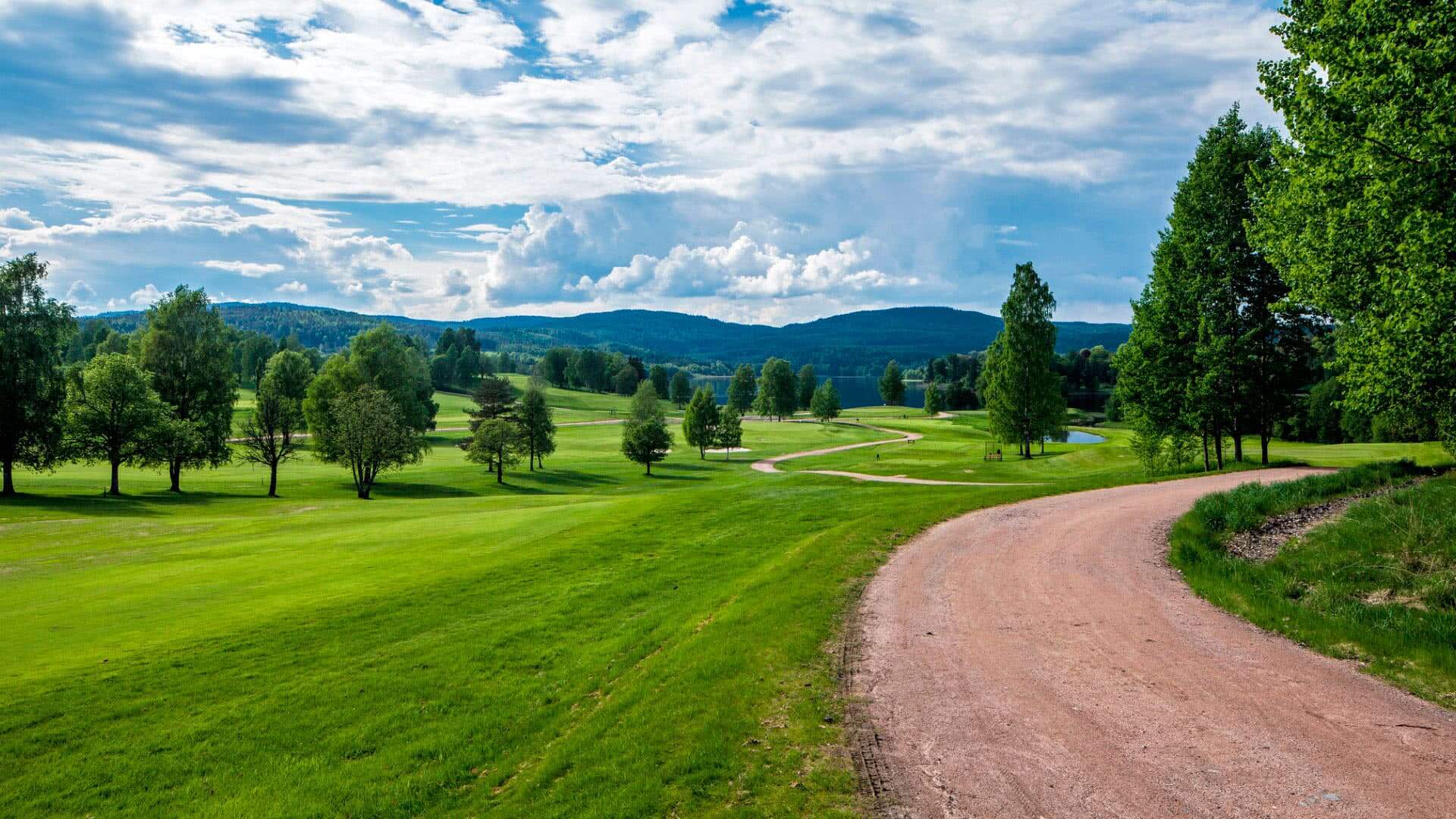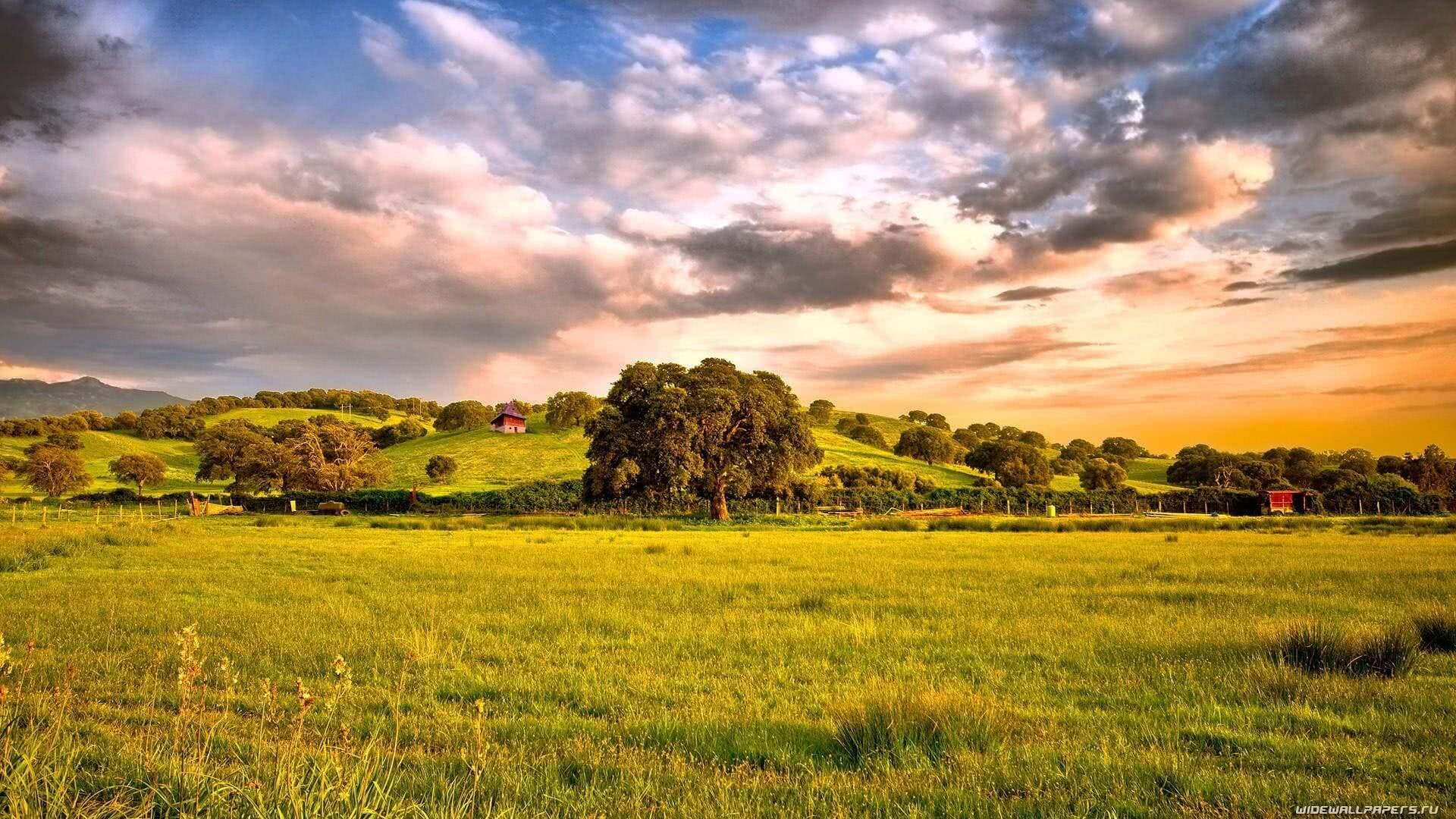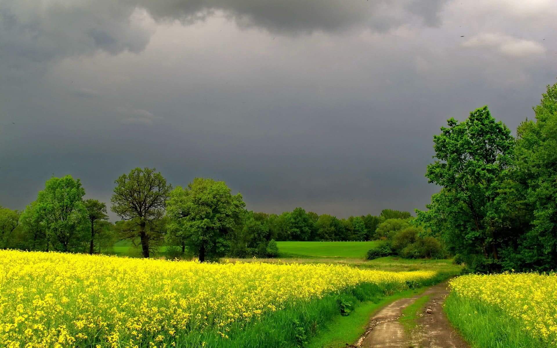 Красивые обои на рабочий стол. Дорога, проходящая через поле и лес уходит далеко за горизонт