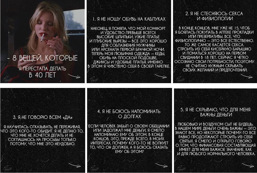 Привлекательность, женственность, успех, самореализации и многие другие темы можно найти по фирменным хештегам автора. Она также выкладывает богатые на эмоции и содержание списки книг, рекомендуемых к прочтению.