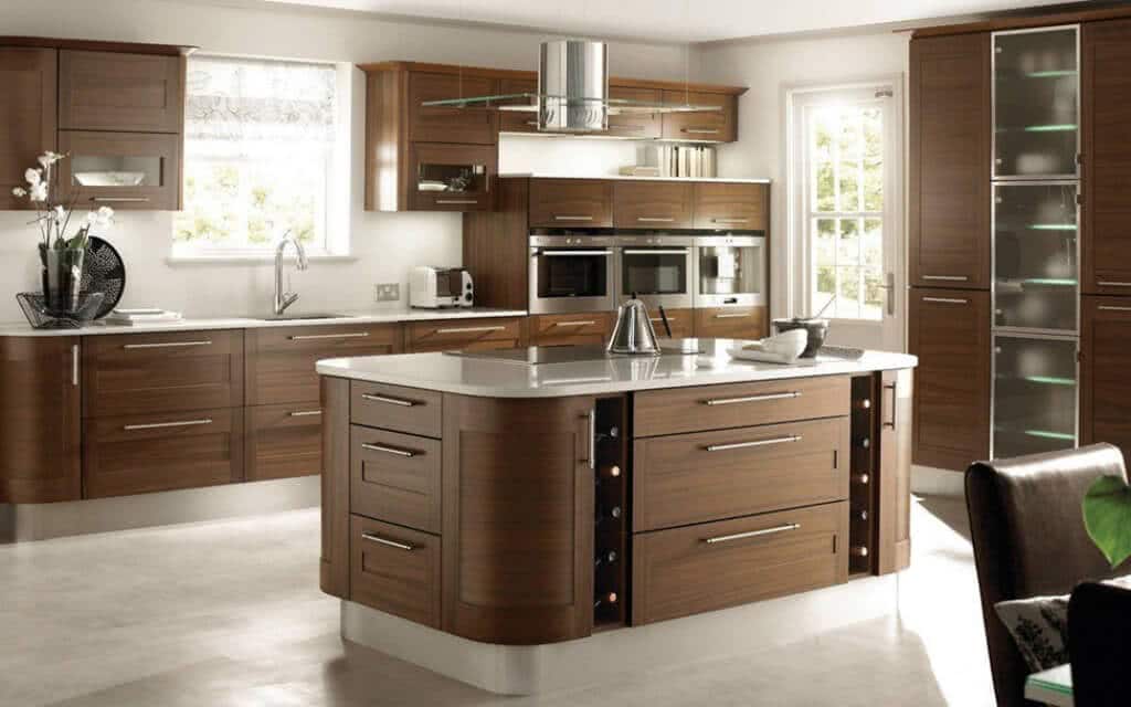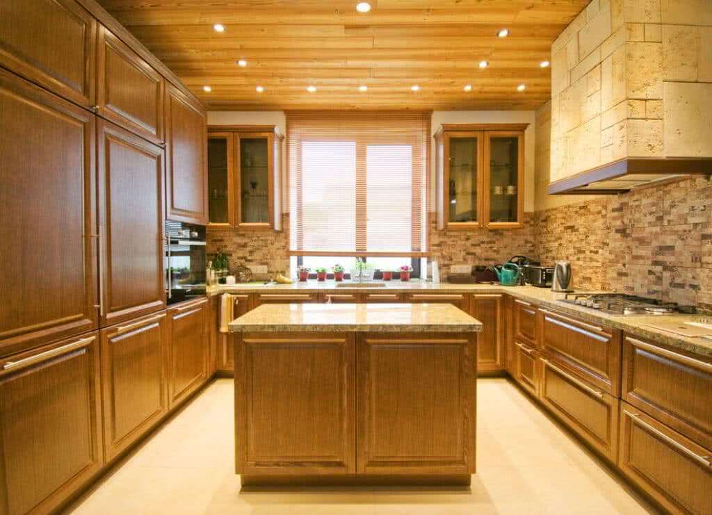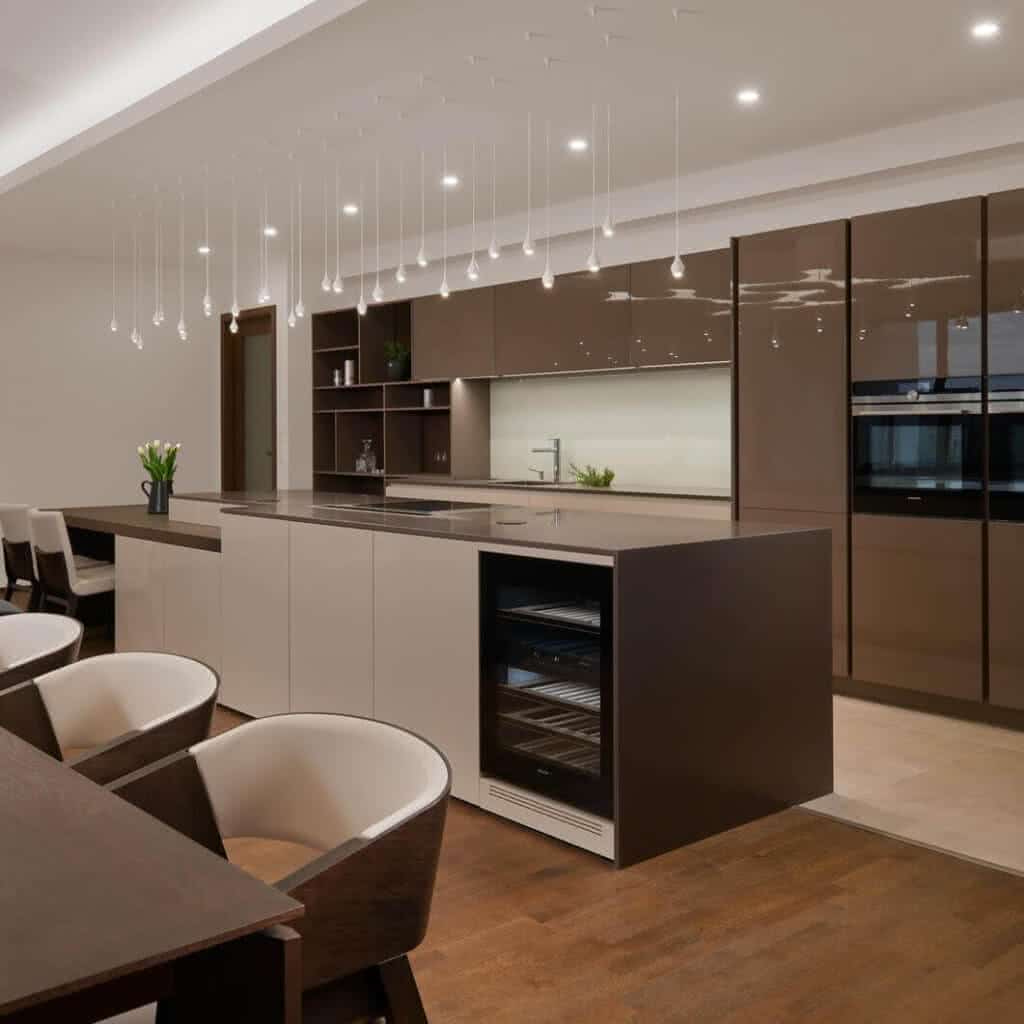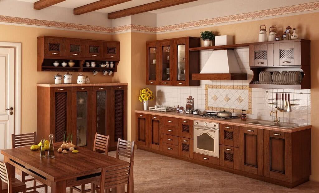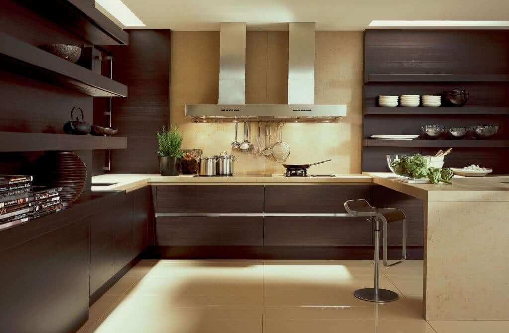 Что касается полового покрытия, подойдут ламинат или паркет. Фартук украсит плитка в тонах, приближенных к коричневому цвету. Благородный шоколадный цвет подчеркнет теплое освещение.