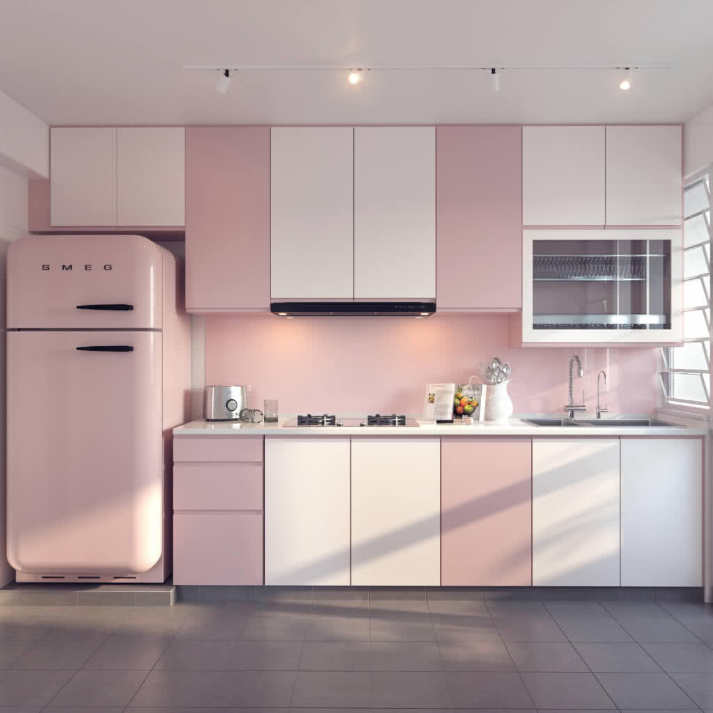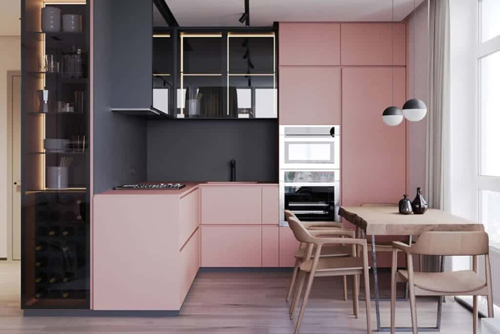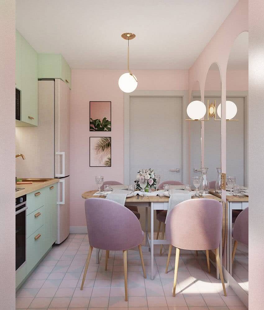 Чтобы избежать инфантильной атмосферы на кухне и гостиной, где есть розовый, откажитесь от цветочных и растительных принтов. Геометрический или этнический орнамент не вызовет намека на детскую комнату.