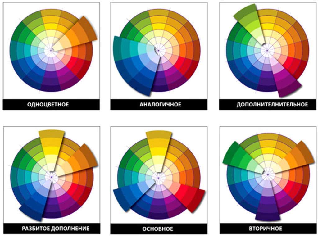 Эти 12 цветов входят в так называемый цветовой круг. Чтобы соблюсти гармонию, выбирают их нужно по триадам: синий-красный-жёлтый, фиолетовый-оранжевый-зеленый и три оттенка, находящиеся в круге рядом. Кроме этого, гармонируют диаметрально противостоящие: желтый и фиолетовый, оранжевый и синий, красный и зелёный цвета.