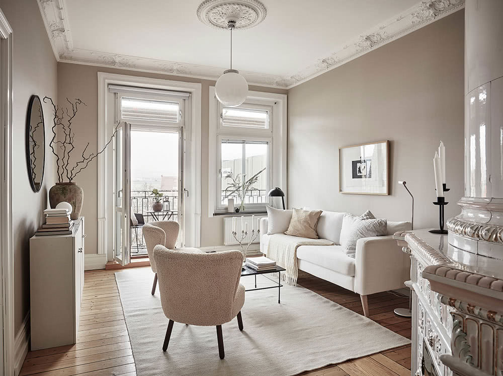 Такой тон хорошо подходит для разных помещений, но обычно дизайнеры любят его брать для гостиной, кухонного помещения, спальни.