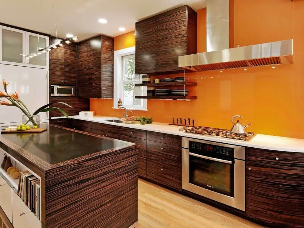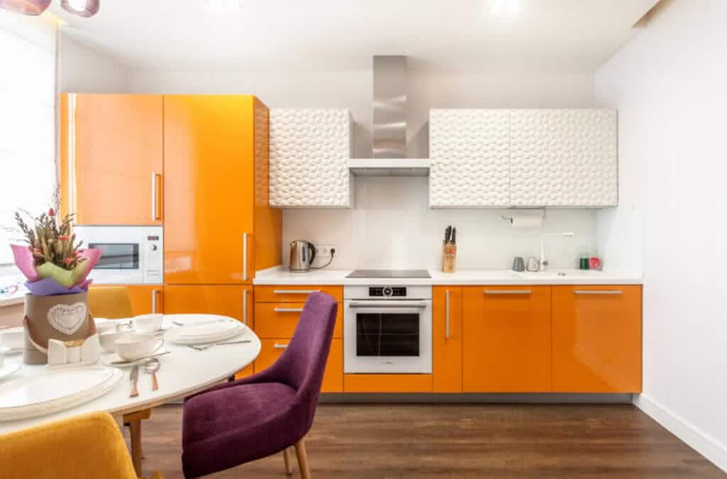 Не советуем использовать его в качестве фона, максимум — окрасить одну стену или потолок. На кухне к оранжевому гарнитуру понадобится дополнение в виде одного или двух предметов декора.