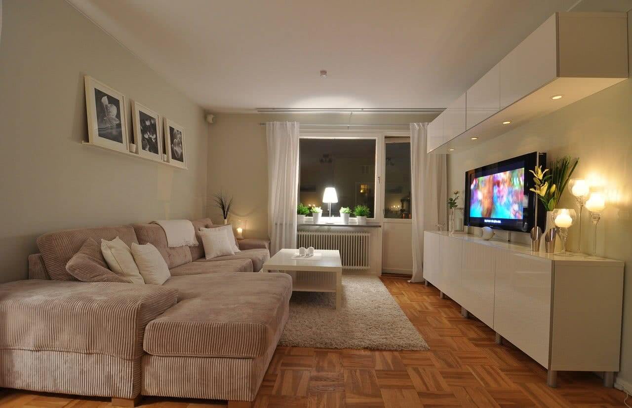 Приятно также проводить и семейное общение в такой комнате, отдохнуть после рабочего дня. Часто беж для зала используют в провансе, классике или модерне.