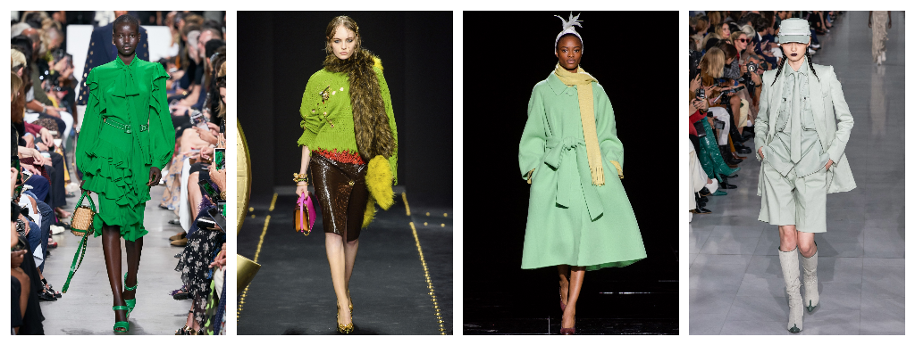 Институт цвета Pantone выделяет огромное количество самых разнообразных и невероятных оттенков зеленого, начиная от лесного и цитрусового, и заканчивая ультрамариновым, изумрудным и нефритовым. Один из самых интересных и в то же время сложных для сочетания является мятный цвет: стилисты говорят, что он редко кому идет. Однако в остальном из всего многообразия зеленых оттенков каждый может подобрать себе тот цвет, который пойдет именно ему. Разные оттенки зеленого идет блондинкам, брюнеткам и в особенности девушкам с рыжими волосами. Также стоит подбирать оттенок в зависимости от цветотипа кожи. К примеру, совсем светлым девушкам и женщинам точно не стоит выбирать мятный оттенок, поскольку в таком случае кожа будет казаться еще более бледной.