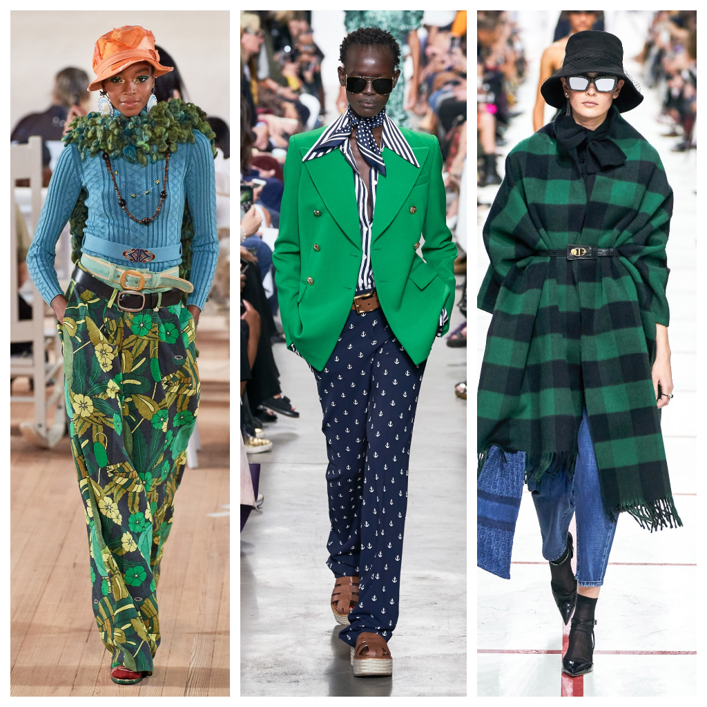 Еще одна модная тенденция — использование зеленого в сочетании с клетчатым принтом. С одной стороны, клетка приглушает насыщенный зеленый, делая его более спокойным. С другой — зеленый цвет в сочетании с темной клеткой становится более сочным. В осенне-зимней коллекции Dior зеленый клетчатый принт стал настоящим хитом.