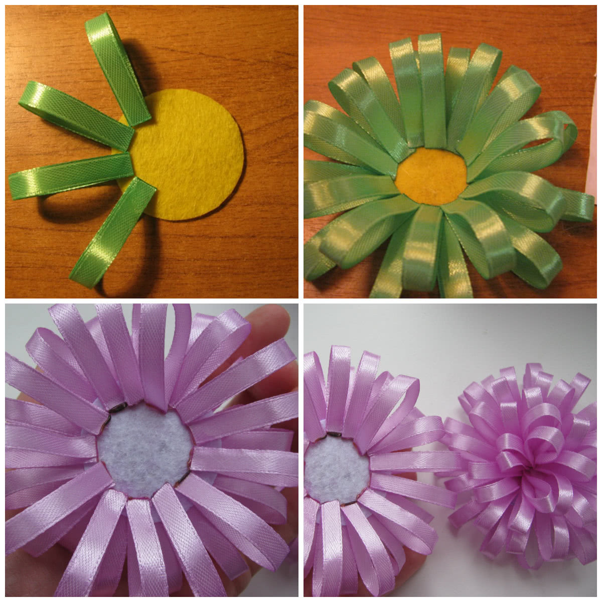 По примеру ромашки для начинающих мастериц доступны простые и красивые канзаши, нужно лишь брать ленты разных цветов.