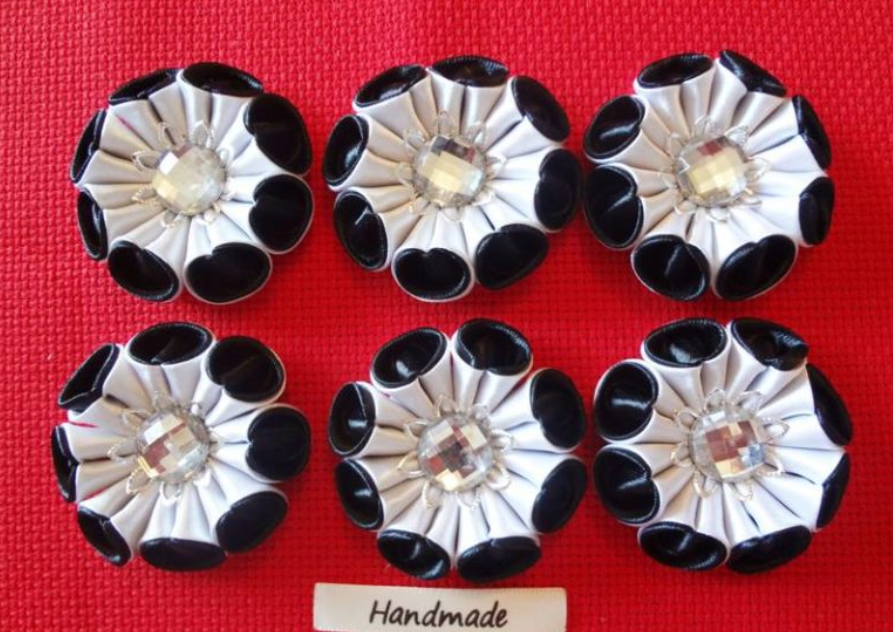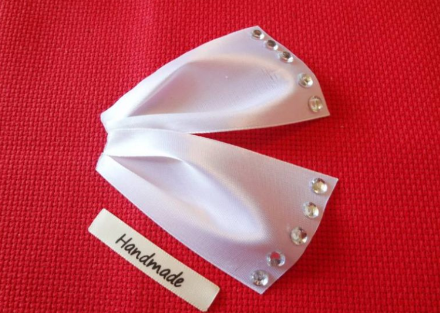 В дополнение к белым бантам канзаши можно придумать несколько вариантов серединок, закрывающих швы и стыки склеенных лепестков. Это блестящие камушки или полубусинки, вставленные в металлические держатели, стразы, которые просто приклеиваются на материал, целые бусинки или пуговицы, которые пришиваются нитками. Для маленькой девочки можно сделать мультяшные акриловые бусинки, например, Хеллоу Китти. Подойдут и другие акриловые детальки – бабочки, сердечки, цветочки. Красиво будет смотреться шамбала круглая и блестящая.