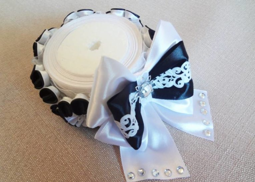 - белую атласную, с шириной пять сантиметров и длиной метр сорок;