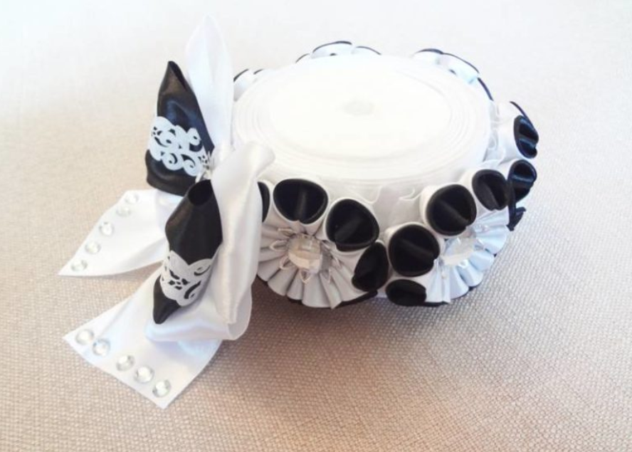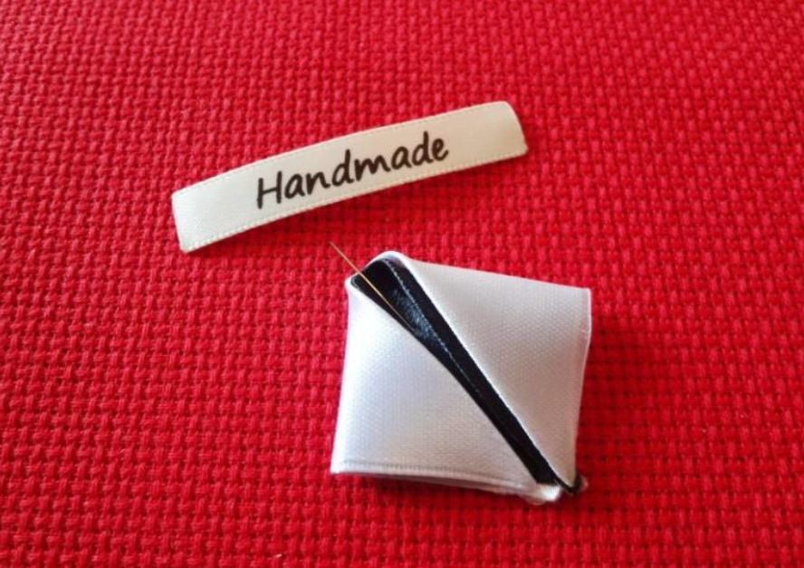 - Заготовить квадраты из атласной белой ленты шириной 5 см;