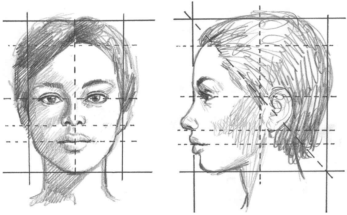 На рисунке головы в профиль линия роста волос расположена примерно вдоль диагональной линии, разделяющей голову пополам. Форма головы такая, что ее длина по горизонтали примерно равна длине по вертикали, если не учитывать выступающий нос. Ухо находится сразу за линией, разделяющей голову пополам по вертикали