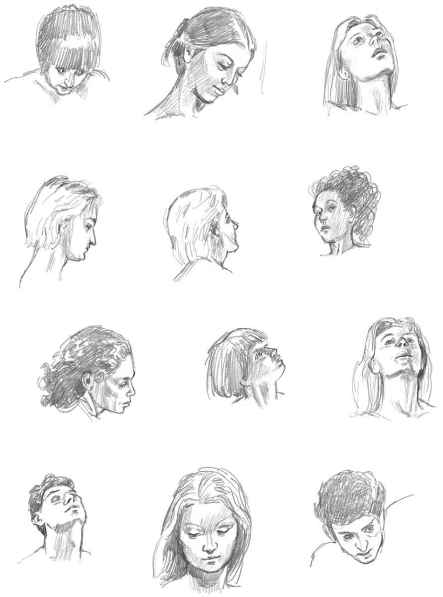 Теперь вам нужно будет изучить несколько примеров изображения головы в разных положениях, потому что не всегда вы будете рисовать головы своих портретируемых точно анфас или в профиль. На некоторые из них вы будете смотреть чуть ниже, а на другие — немного сверху. В первом случае вы будете видеть проекцию челюсти, а нос окажется короче и будет почти закрывать часть глаза. Во втором случае можно увидеть большую площадь верхней части головы, а рот нередко исчезает под проекцией носа.