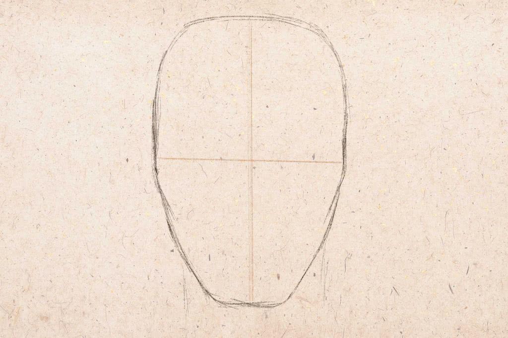 Первый этап самый простой, нам нужно обозначитьформу лица, его проще всего вписать в овальную, яйцевидную или другую округлую фигуру. Вертикальная ось поможет создать симметричный рисунок, горизонтальная правильно показать глаза.