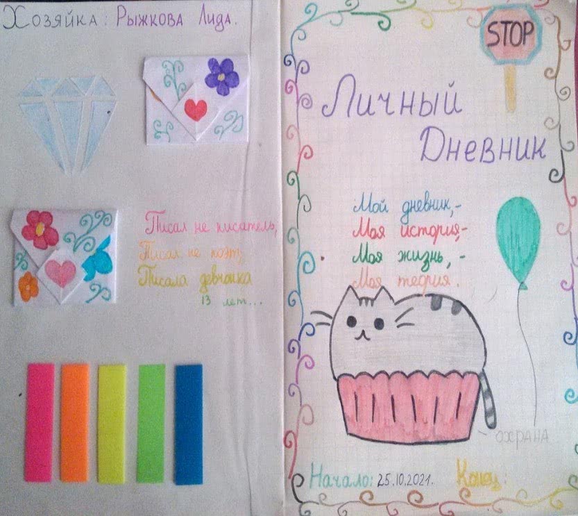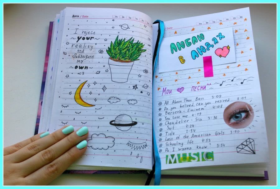 Мой личный дневникУ каждого свои причины для обращения к слову. Для кого-то – память, кому-то – ориентир на пути к успеху. Вновь пережить вкус понравившегося блюда реально: кулинары и любители вкусно поесть могут пошагово изложить процесс приготовления, дополнив его красочным описанием вкусовых ощущений. Иллюстрации, сделанные обычным карандашом или маркером, помогут воссоздать такой шедевр самостоятельно. Многие люди, так или иначе, занимаются саморазвитием. Одни смотрят фильмы, другие читают книги, третьи ходят на семинары… Информация, полученная из этих источников, влияет на жизнь, меняет восприятие. Поэтому, делая мини-отзыв на понравившийся фильм или книгу, человек переосмысливает себя, становится лучше. Туристы или путешественники привозят из поездки сувениры и магнитики. Сохранить на память воспоминания об увлекательном отпуске способны заметки, подкреплённые «артефактами». Билет на самолёт, меню из ближайшего ресторанчика, распечатки разговорника для общения с местным населением – всё это годится для того, чтобы заново испытать незабываемые эмоции. Выставляя новые цели, спортсмены прописывают ежедневные «шаги» на пути к свершению. Отмечать успехи и анализировать неудачи будет легче, если вести регулярные отчёты о достигнутых результатах. Для умельцев и рукодельниц разработка новых идей для творчества не представляется без эскизов и зарисовок с подробным описанием процесса. Модель нового платья, предмет интерьера или сувенир для подарка, сделанные своими руками, — это именно то, что можно в подробностях описать и нарисовать в личном дневнике. Идеи оформления личного дневника для девочекИдей по оформлению личного дневника для девочек может быть много, все зависит от желания, фантазии и предпочтений. Кто-то увлекается рисованием, поэтому для него дневник изрисован забавными рожицами, фактурами.
