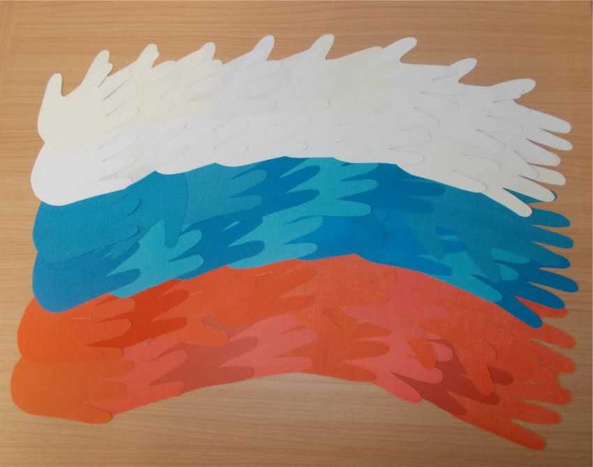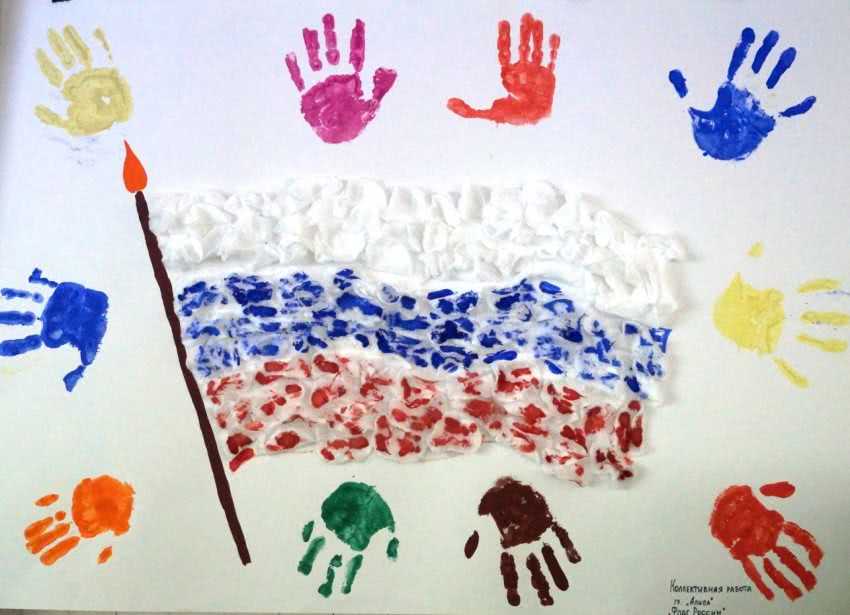 Очень необычно и оригинально смотрится поделка флаг из детских ладошек. Обведите детские ладошки на цветной бумаге или любой другой декоративной бумаге, а затем приклейте к листу плотного картона.