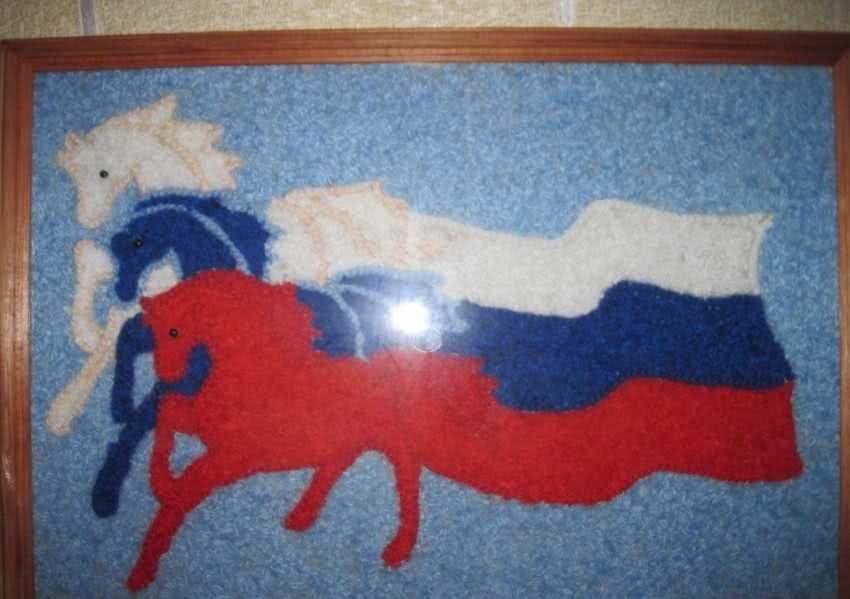 Изысканно и аккуратно смотрится флаг, выполненный из атласных лент. Обязательно поместите свою поделку в рамке.