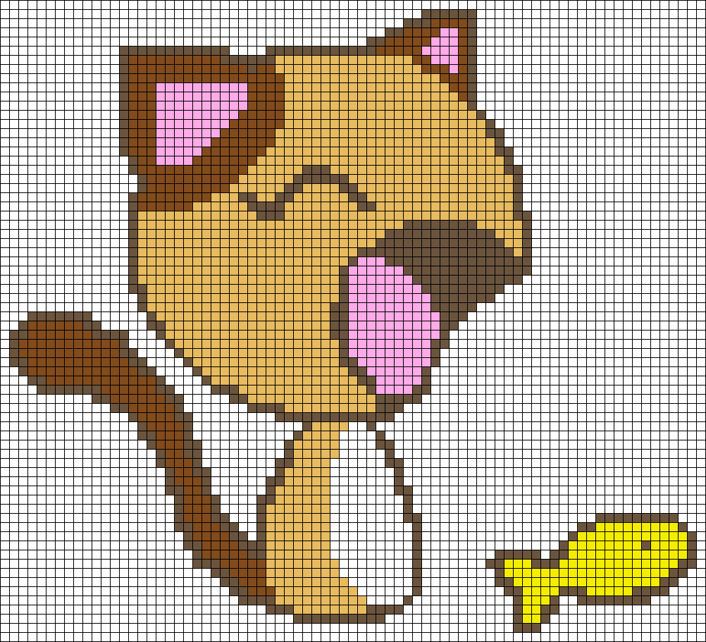 Милый котенок. Я сама такой нарисовала. Только несколько оттенков коричневого цвета. Одна клеточка- закрашиваем, три клеточки пропускаем. Несколько минут и картинка готова. А ведь можно такую нарисовать на миллиметровке, просто в пропорциях увеличив количество клеточек и все будут удивляться вашему таланту.