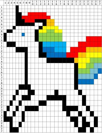 Нарисовать разноцветного единорога просто, если следовать образцу. Ребенку, выполняющему рисунок, понадобится клетчатый прямоугольник размером 27х27, материалы разнообразных цветов для гривы и хвоста, а также черный карандаш для контура.