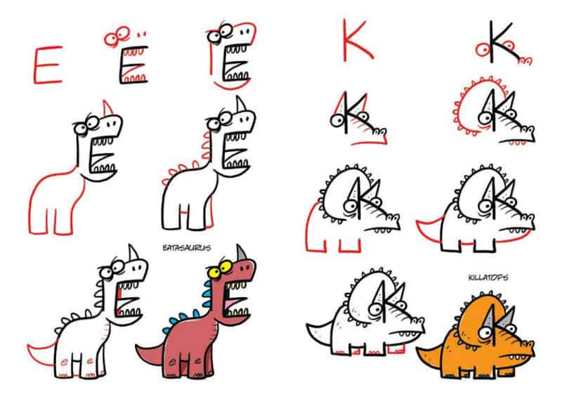 Посмотрите как из английских букв, можно нарисовать совершенно безобидных монстриков. Такие схемы рисования помогают ребенку сразу в 3 направления: помогают развивать навыки художника, учат мыслить нестандартно и помогают закрепить английский алфавит.