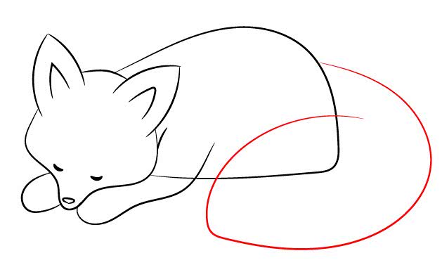 Свернувшись калачиком, спящая лиса представляет из себя самый легкую и простую натуру для рисования. Нарисуйте мордочку и завиток-клубочек. Одной линий получается и спинка и задняя лапка