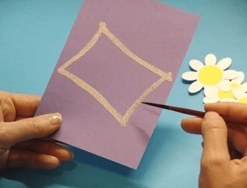 Далее, внутри поделки нужно сделать место для поздравлений и пожеланий для бабушки. Для этого, из цветной бумаги вырезать квадрат и приклеить его по центру, любой из сторон открытки.