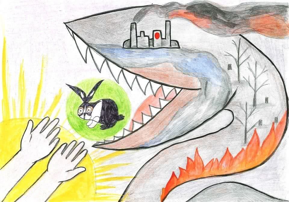 На плакате нарисовано антропогенное действие в виде акулы, которая пожирает все живое на своем пути.