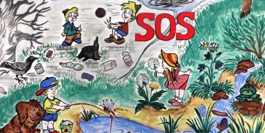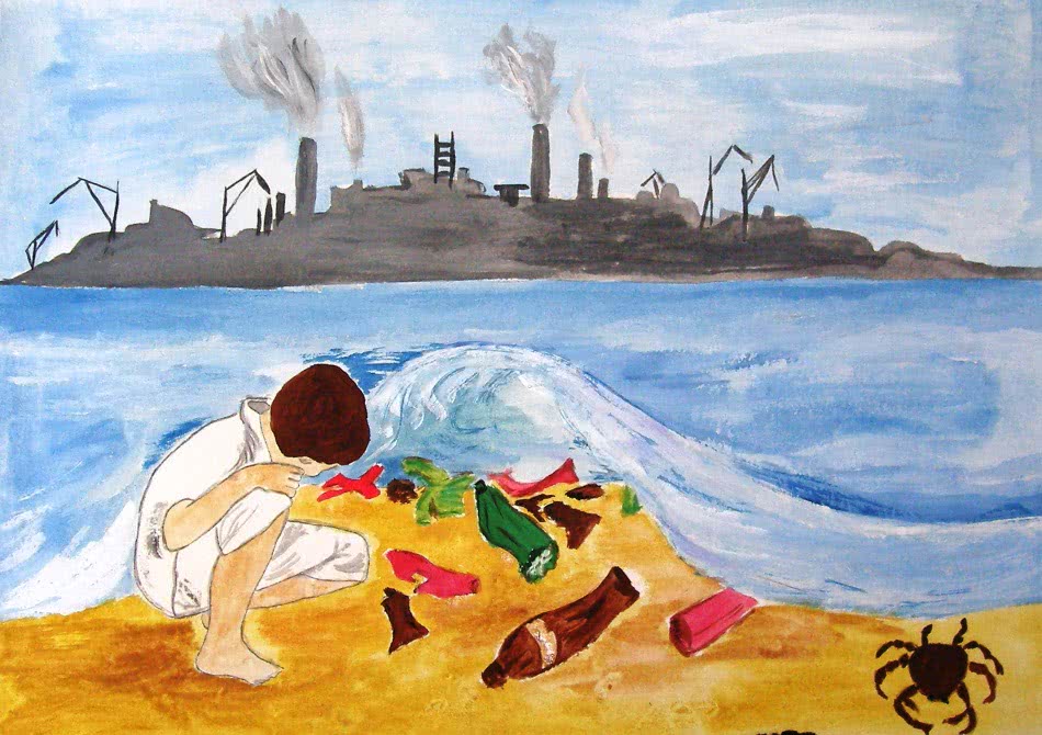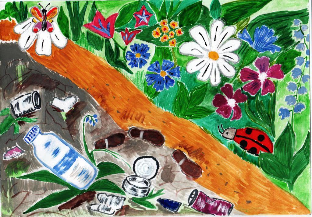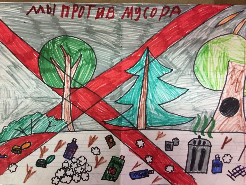 Рисунок карандашами, в котором ребенок призывает не выбрасывать мусор в водоемы.