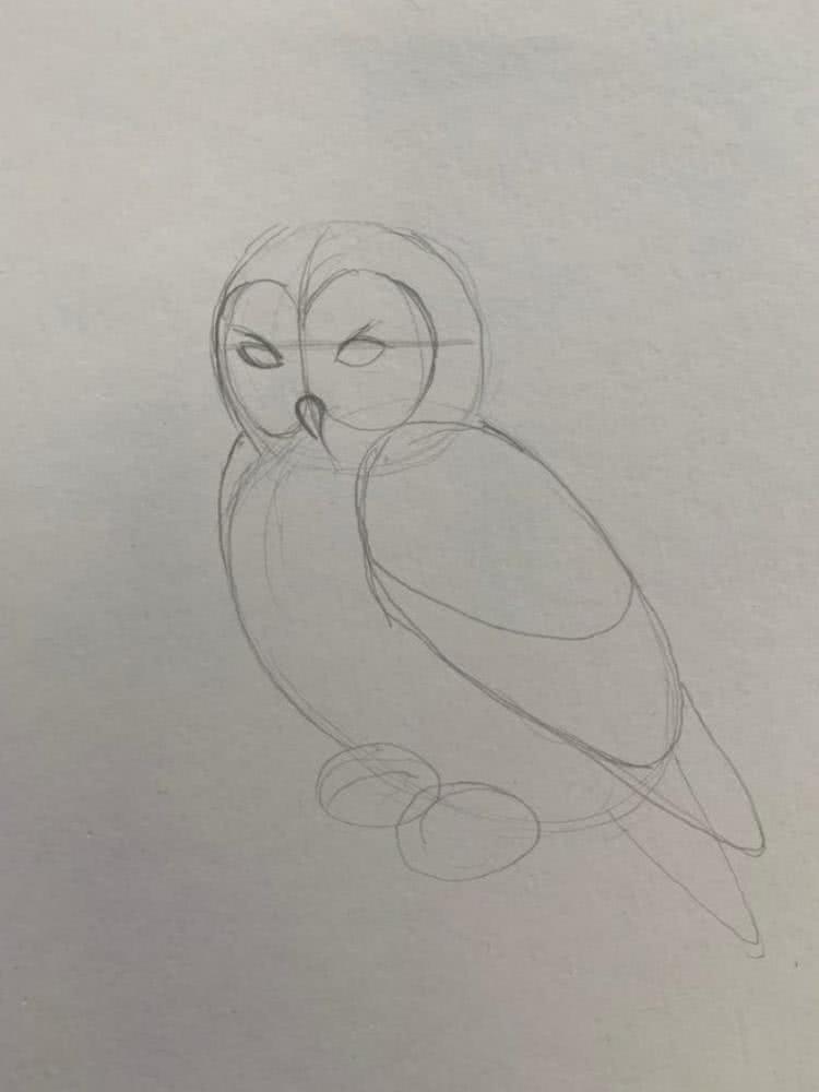Используя карандаш НВ, намечаем форму совы простыми геометрическими фигурами. Голову мы рисуем кругом, тело – овалом, также намечаем крыло овалом. Добавляем к крылу нижнюю острую часть и верхнюю закругленную. Тем самым у нас крыло становится разбито на три части: обозначаем лапы овалами, показываем край хвоста треугольником.