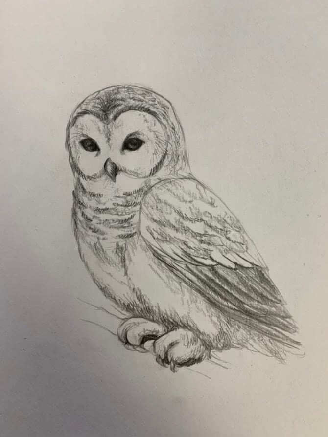 Мы почти нарисовали сову карандашом. Не забудьте — это многочасовая работа, и быстро она не получится. Но вот она близится к завершению. Осталось убрать грязь от карандаша и дорисовать ухо совы.