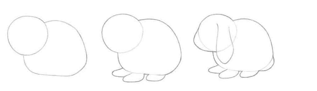 Намечаем форму зайца, вся форма тела тяготеет и расширяется книзу. Уши тоже рисуем опущенными. У зайца виднеются всего 3 лапки, задняя спрятана за туловищем.