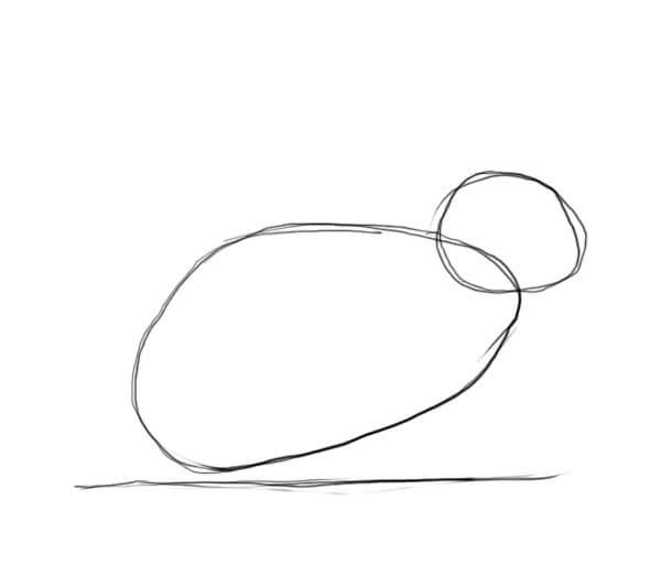 Тремя фигурами намечаем будущую работу — линия — земля, на которой сидит заяц, овал — тело, шар — голова.