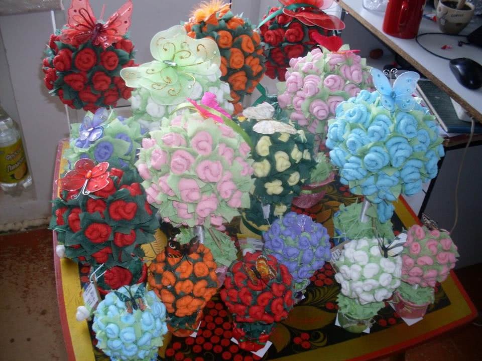 Роза из салфетки своими руками данным способом делается достаточно быстро и просто. Чтобы собрать топиарий, необходимо склеить композицию в шар. Он нанизывается на длинную шпажку, для которой можно использовать карандаш или специальное крепление. Основание помещается в горшочек. Внутри его можно закрепить при помощи других салфеток, декоративных камней и прочих деталей.