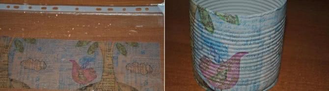 Чтобы приклеить салфетку аккуратно, положите ее на файл лицевой стороной и налейте совсем немножко воды. Хорошо распрямите салфетку. Теперь аккуратно приложите ее на банку, на которую предварительно нанесено немного клея.