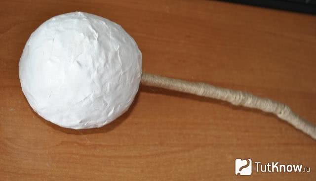 Если у вас пенопластовый шар, проделайте в нем отверстие по диаметру ветви, добавьте сюда клея и зафиксируйте эту палочку. Если нет такой круглой основы, тогда сделайте ее из бумаги и клея по методу папье-маше.