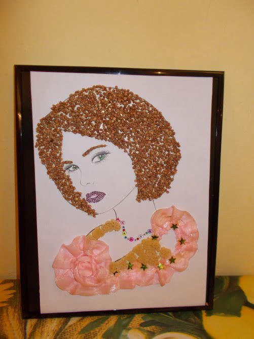 Приклеиваете готовый глаз на черную бумагу, отрезаете полоску, надрезаете реснички. Готовые детали располагаете на портрете. Рисуете нос, а брови и рот вырезаете из бумаги. Из ткани вырезаете одежду, приклеиваете на картон. Ее можно украсить пуговицами, кружевом, тесьмой. Приклейте к картонной заготовке серьги, украшения для волос. Теперь приклейте полностью портрет на картон и поставьте в фоторамку.