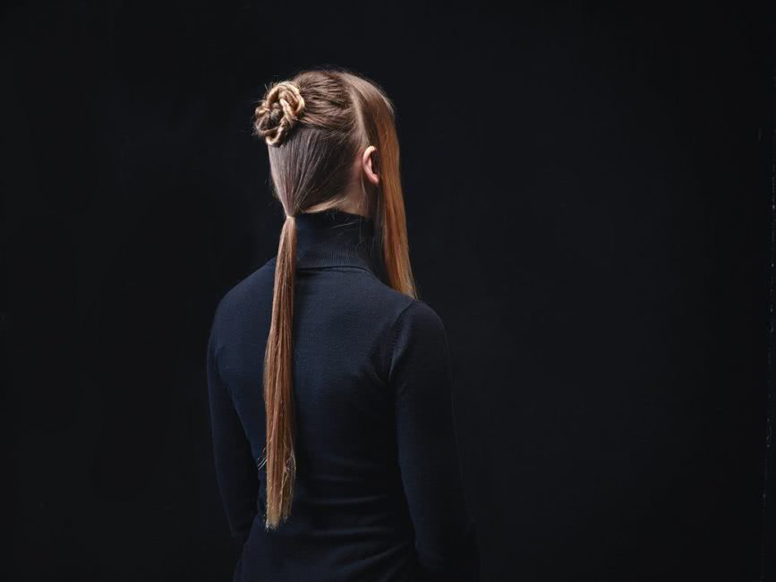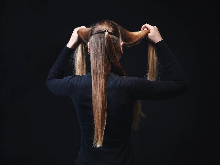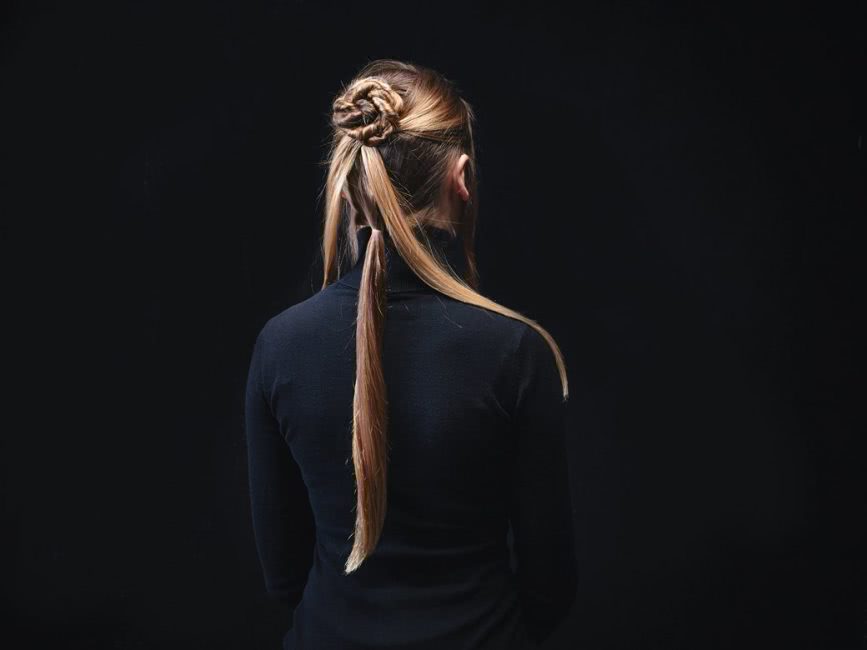Из хвоста делается двойной жгут и скручивается в пучок. Его лучше всего скреплять шпильками. Если их нет, то можно попробовать использовать для этого невидимки.