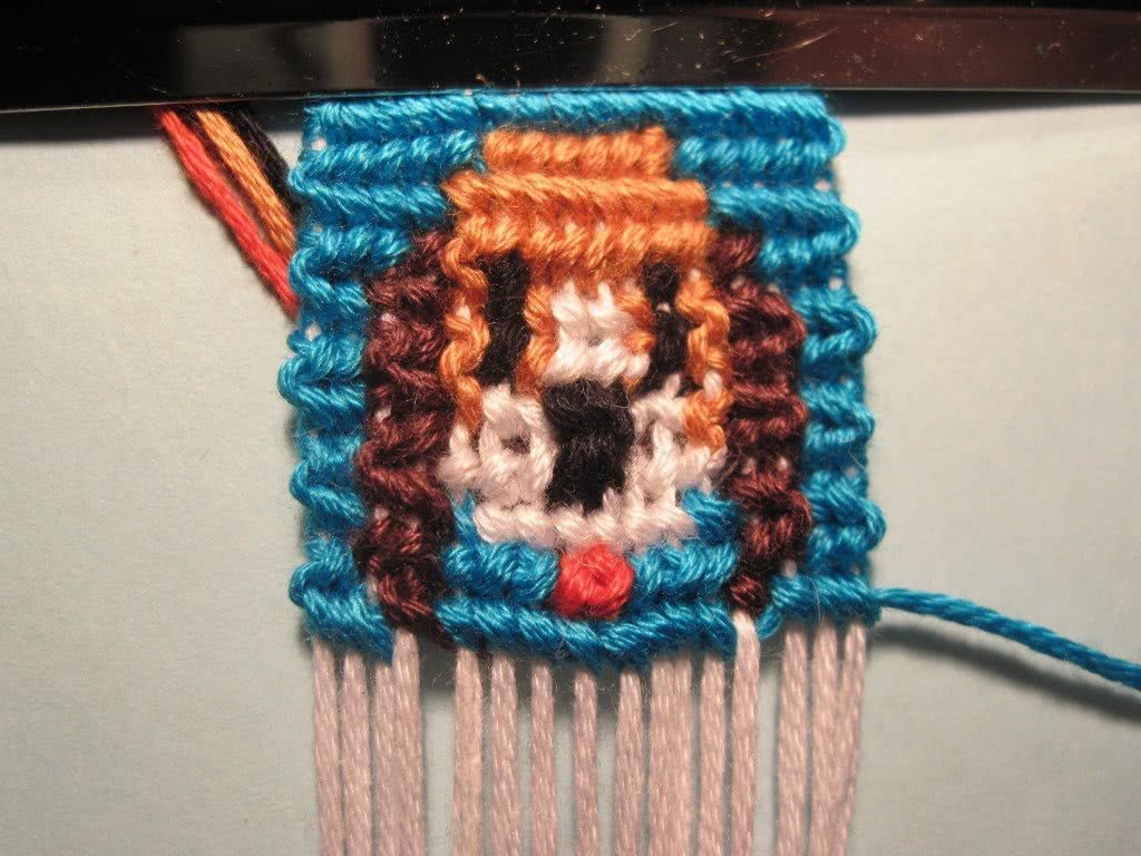 Первый ряд создает белый фон — все узелки белого цвета. Со второго ряда, начинает провязываться сама буква, для этого на соответствующих нитках провязываются узелки синей нитью. После того как сама буква полностью связана, провязывается одни ряд фоновым (белым) цветом.Обратите внимание, что воспользовавшись программой-генератором, можно получить схему для вывязывания фенечек из мулине не только с именами, но и с достаточно сложными узорами. При этом, если Вы освоите технику вязание «браслетов дружбы» из мулине, то вполне можете самостоятельно придумывать интересные способы вывязывания имен, пытаясь использовать не только прямое, но и косое плетение или же сочетание разных способов.