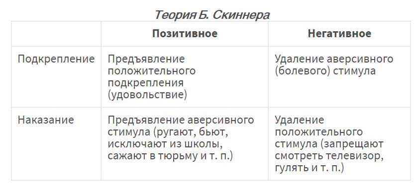 Скиннер назвал подобные паттерны поведения оперантами, то есть формами поведения, которые представляют собой выработанный механизм: крыса проголодалась – нажала на педаль. При этом положительные последствия такого поведения учёный обозначил как «подкрепления». В ходе многочисленных опытов с различными видами подкреплений Скиннер выяснил, что прослеживается закономерность с оперантами, после которых следуют положительные последствия. Она заключается в том, что такие формы поведения встречаются гораздо чаще других. Получается, что, если крыса «знает», что после нажатия на педаль она получит пищу, то подобное действие она будет повторять чаще других.