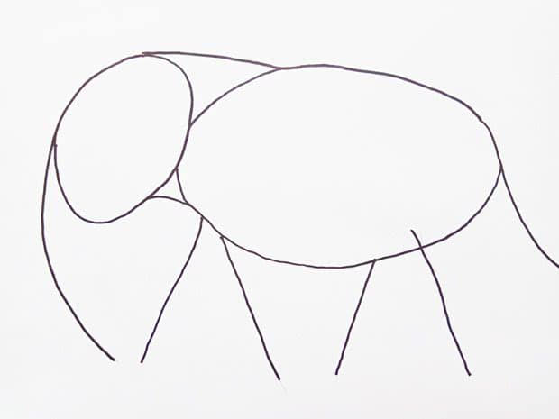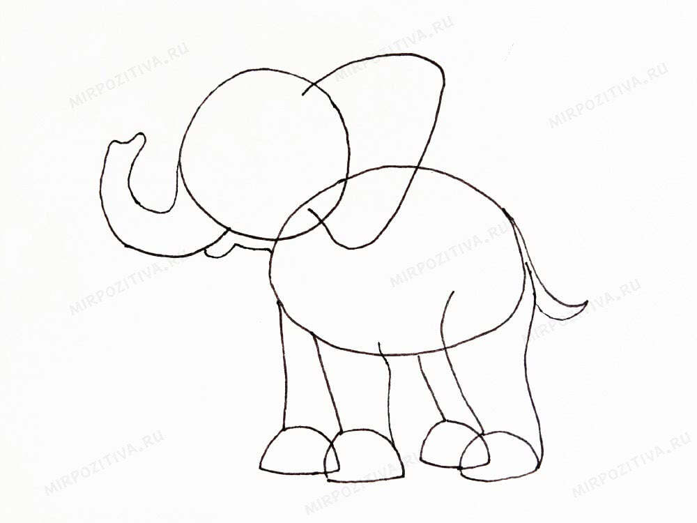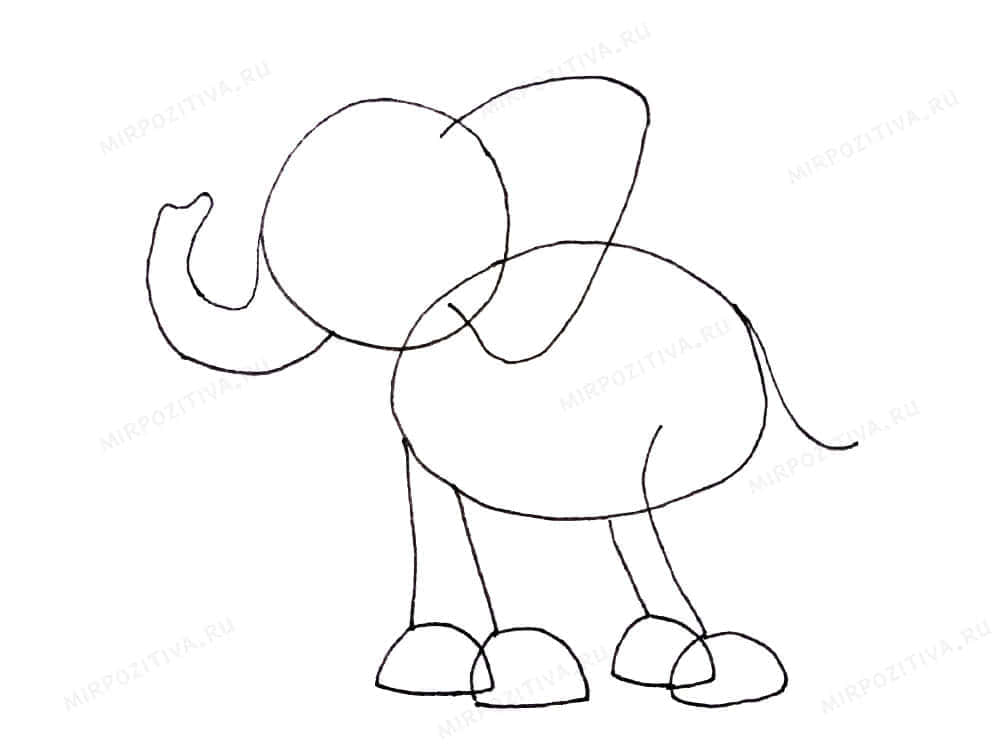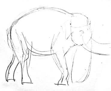 Туловище, голову, конечности, хобот, уши очерчивают овальными линиями, намечая места расположения частей тела. Наибольший овал – туловище. Чуть меньший – голова. К большому овалу схематически добавляют части конечностей, находящиеся в корпусе, соединяют голову с туловищем шеей.